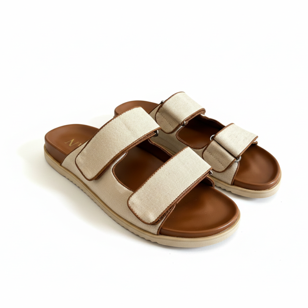 Elevate your summer wardrobe with this sophisticated mixed-material sandal. Crafted with a premium beige canvas upper and a full leather interior, this design offers the perfect balance of texture and luxury. Finished with our sivan gold logo and a tonal outsole for a clean, contemporary aesthetic.